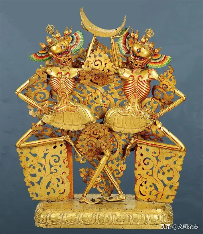 镶金银长号架,西藏17至19世纪,拉萨布达拉宫管理处藏。此架单层莲台上立着两位尸林主,舞姿左右对称。尸林主据说是由莲花生大师收伏的苯教神,以骷髅造型为主,尸林主可以使恶灵退却。