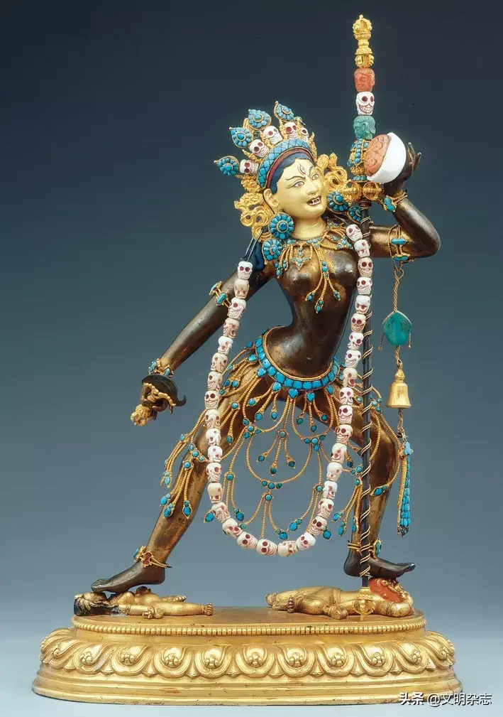 空行母像,西藏17至18世纪,铜鎏金,局部泥金彩绘,拉萨罗布林卡藏。空行母是对女性密乘修习者的尊称。这种空行母像也叫“那若空行母”,那若即智慧之义。
