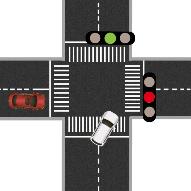 先进入交叉路口的车辆有优先通过权。如图所示,在有交通灯的路口,白车行驶方向已变成红灯,但是路口内车辆还未全部通过,而红车直行车辆已是绿灯,则应该让先进入路口车辆先行。