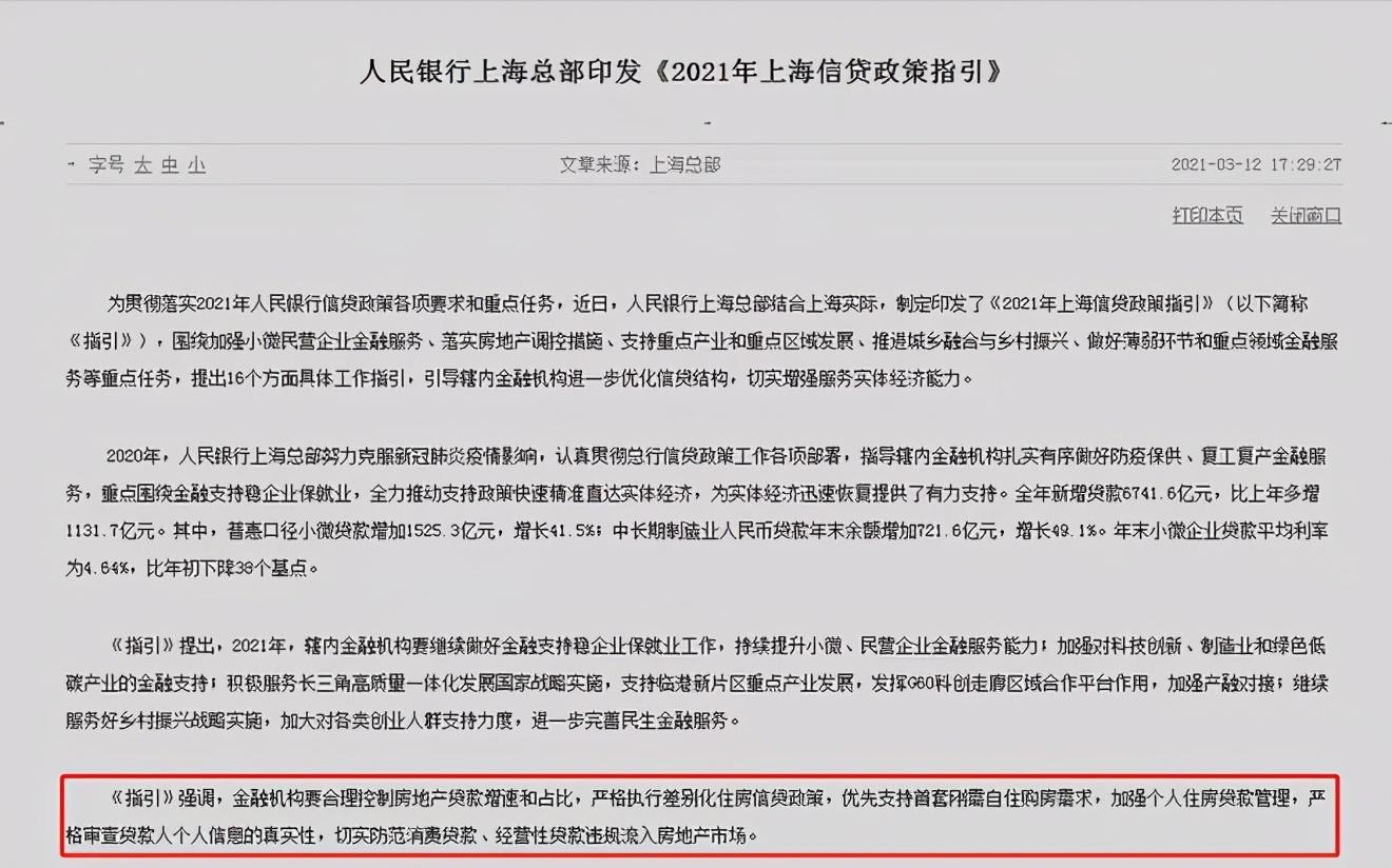 3月12日,中国人民银行上海总部发布《2021年上海信贷政策指引》,要求金融机构合理控制房地产贷款增速和比重,严格执行差别化住房信贷政策,优先支持首套刚需自住购房需求,加强个人住房贷款管理,严格检查贷方个人信息的真实性,有效防止消费贷款经营性贷款违规流入房地产市场。目前,以实体融资为幌子,经营性贷款和消费贷多次违反规定进入房地产市场。这些违法行为将导致社会资金“脱实向虚”,中小企业的“融资难,融资贵”的问题将更加严重。