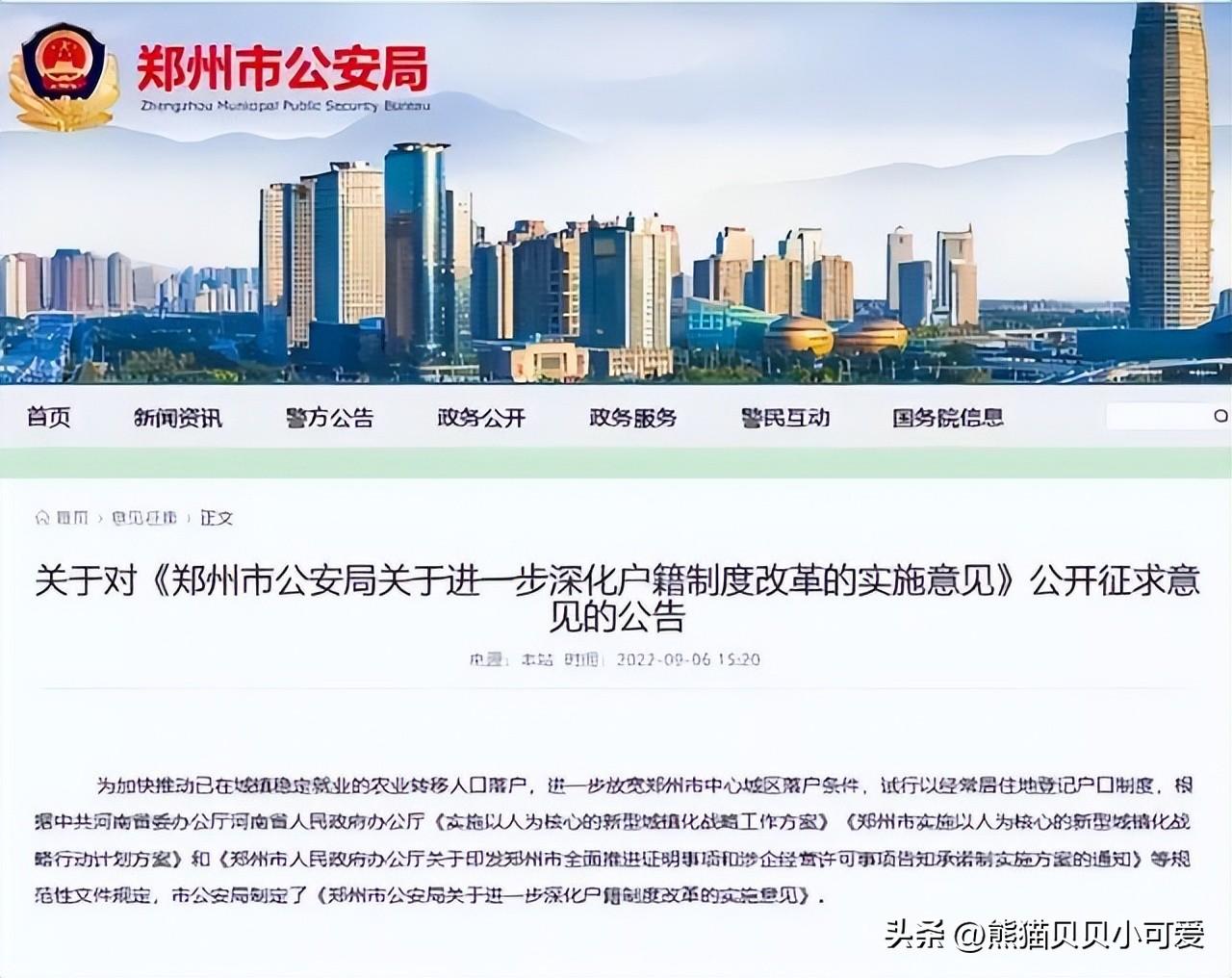 郑州市公安局在9月14日公布的《郑州市公安局关于进一步深化户籍制度改革的实施意见》。