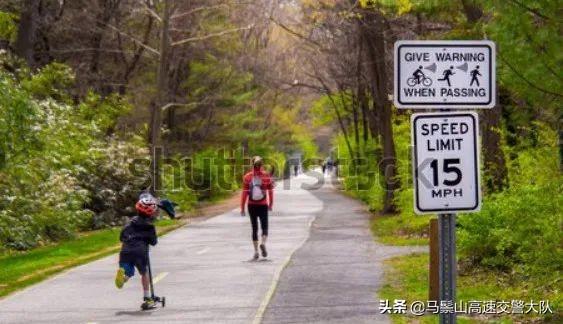 美国共用通道上的标志牌,提示用路人要超越时发出警示声音,即:骑车人警示跑步者、跑步者警示步行者。