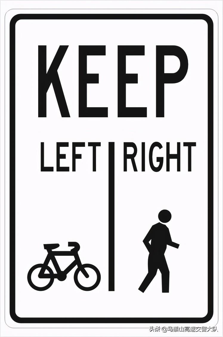 美国设置在自行车专用道内的标志牌,提示人们如何使用道路的法规标志,速度慢的要在道路右侧行走。