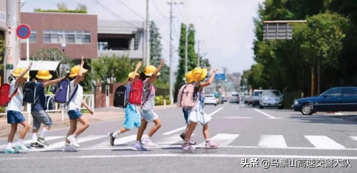 日本小朋友高举着手臂通过斑马线,同时观察来车方向。通过提高高度,增加自身显著性,做好过街示意,完成与驾驶人的互动。