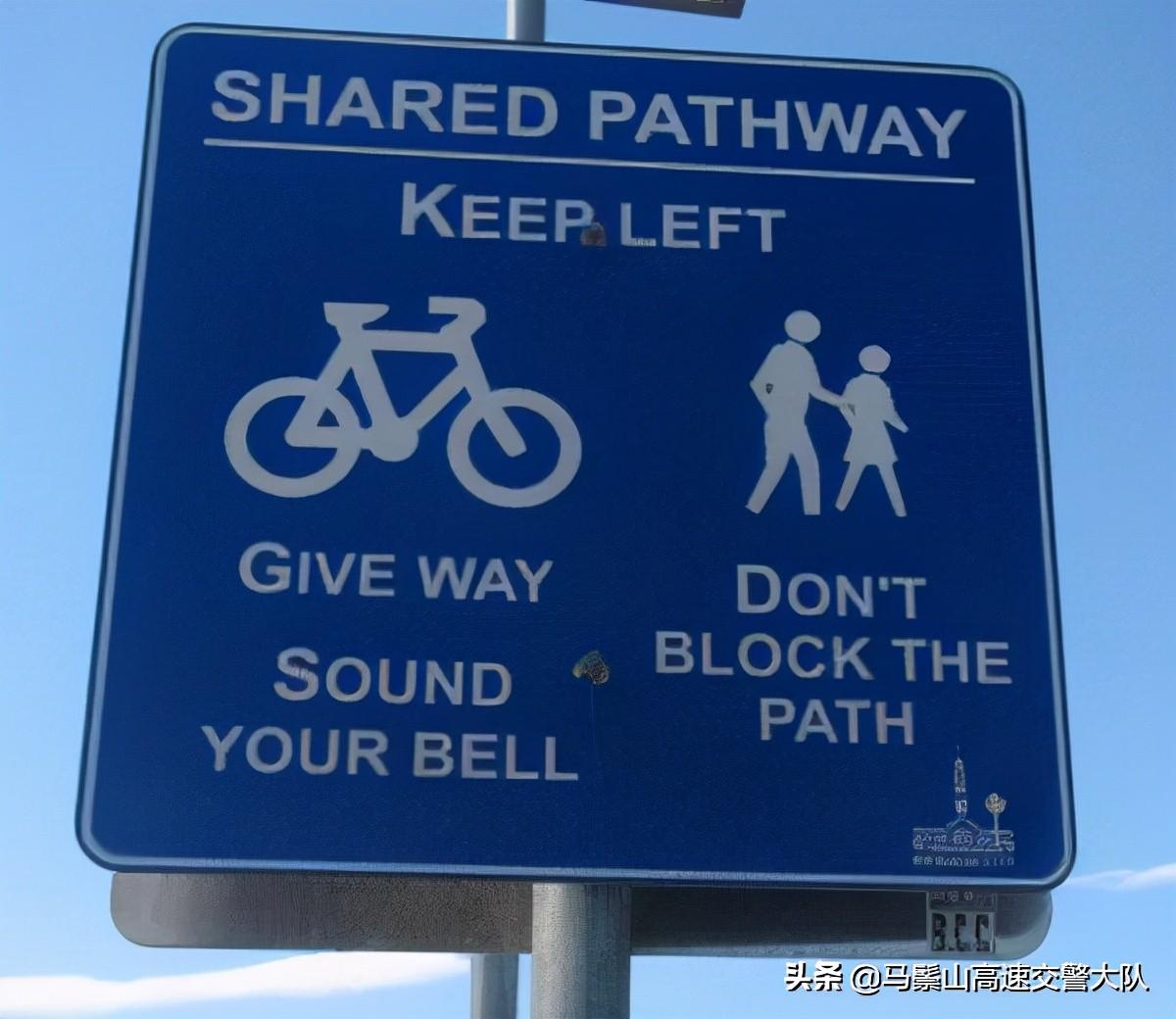 英国的标志牌,提示这里是共享通道,骑车人和行人要靠左侧使用道路,行人不要挡住道路,骑车人超越时要响铃。