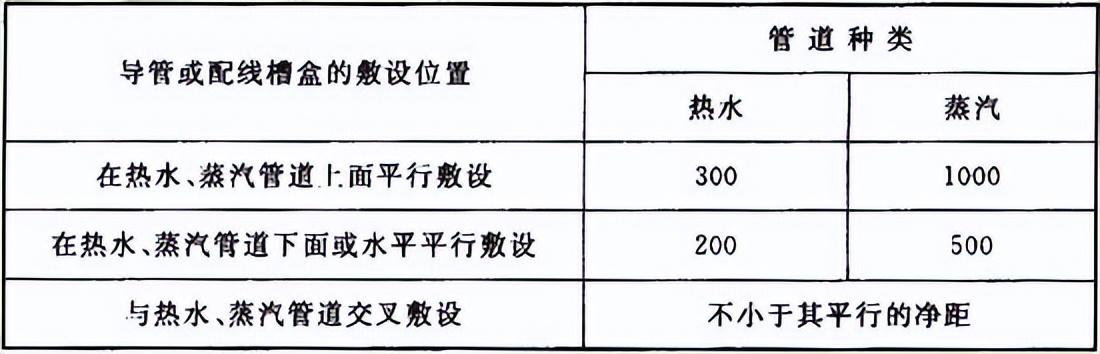注:1 对有保温措施的热水管、蒸汽管,其最小距离不宜小于200mm;2 导管或配线槽盒与不含可燃及易燃易爆气体的其他管道的距离,平行或交叉敷设不应小于100mm;3 导管或配线槽盒与可燃及易燃易爆气体不宜平行敷设,交叉敷设处不应小于100mm;4 达不到规定距离时应采取可靠有效的隔离保护措施。