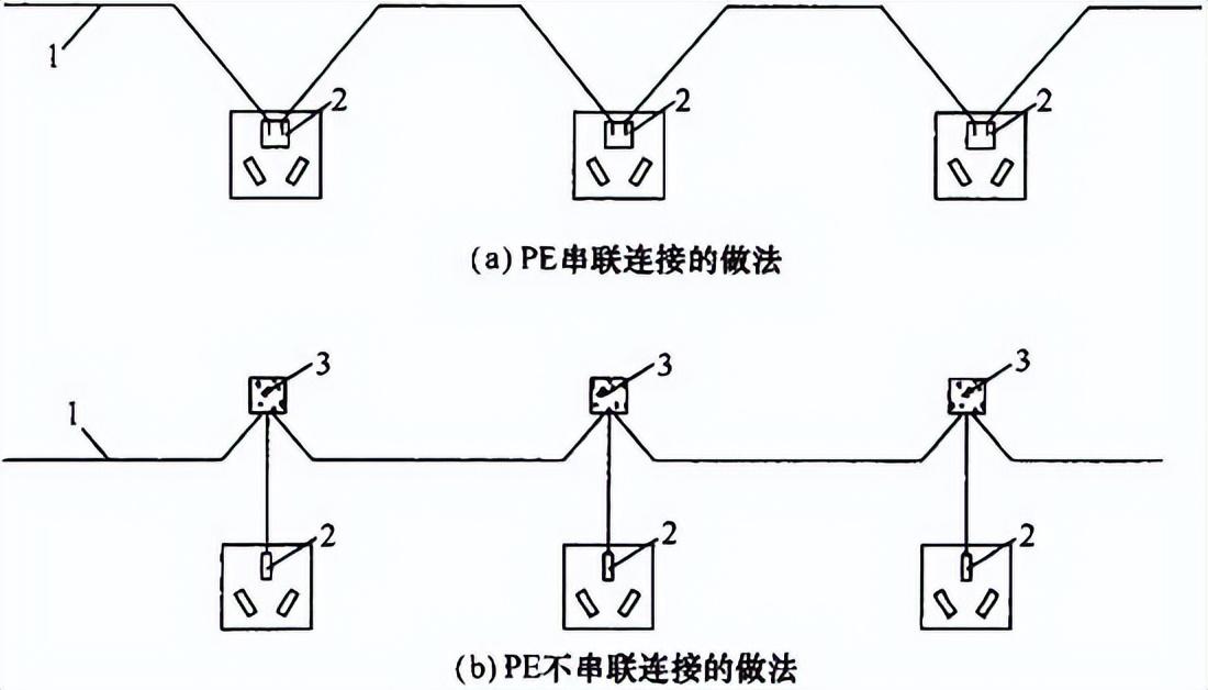 图2 PE线在插座端子处“串联”与“不串联”连接的做法1-PE绝缘导线;2-PE插孔;3-导线连接器