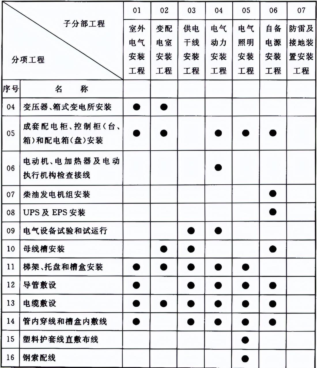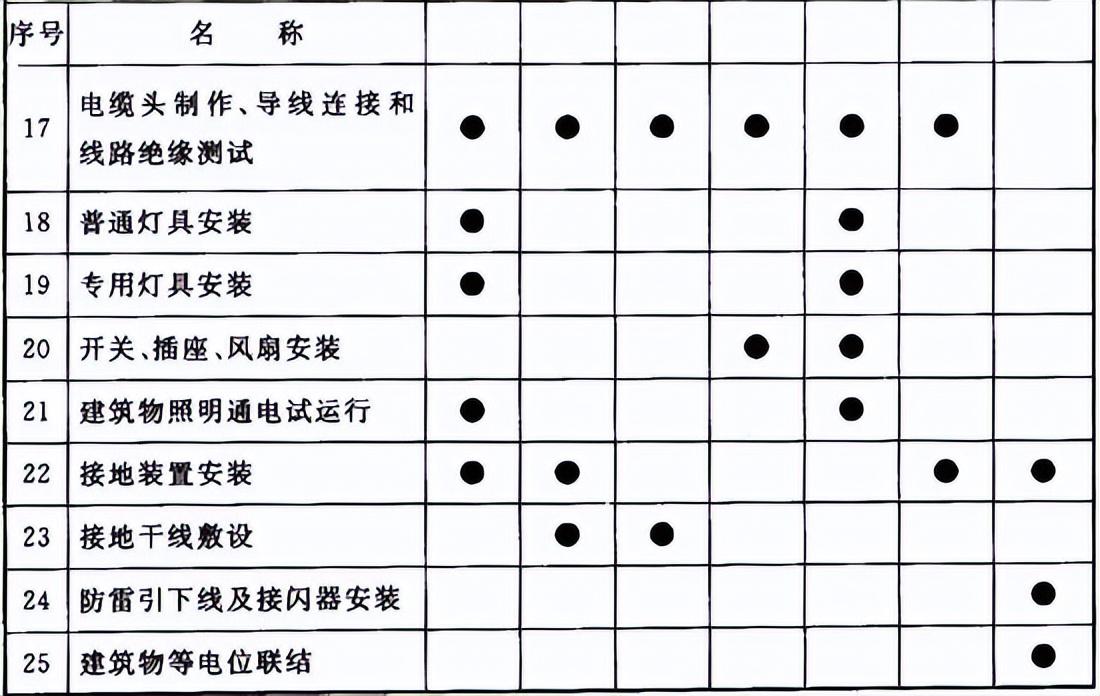 3.4.1 本条的验收方法是与现行国家标准《建筑工程施工质量验收统一标准》GB 50300一致的,附录A对各子分部工程、分项工程和检验批进行了明确的划分,便于现场施工、监理、建设单位相关人员对工程质量实施逐级验收和资料的归类与审查。3.4.2 电气动力和电气照明安装工程中分项工程的检验批划分,要求与土建工程一致,是考虑到电气安装管线预埋必须与土建施工同步,为方便过程验收而提出的要求。3.4.3 为验证施工过程工序质量检查、检验和控制的有效性,并能为施工验收提供复核依据,要求对电气施工过程的重要控制节点应及时做好记录,特提出本条规定。但并不限于本条所列的质量控制资料,对本规范中提及需要进行检验、测试、试验、验证的项目,施工单位均需提供相关质量控制资料。3.4.7 变配电室、技术层、设备层的动力工程、供电干线及建筑物防雷和电气系统接地是电气安装工程的重要部位,质量的好坏将直接影响工程的使用和安全运行,因此应重点检查,考虑到建筑工程的照明及动力工程量大、涉及面广,应由施工单位在施工工序检查中进行全数自查,工程验收以抽查形式为主。3.4.8 为方便检测验收,高低压配电装置的调整试验应提前通知监理和有关监督部门,以便对试验结果进行确认。