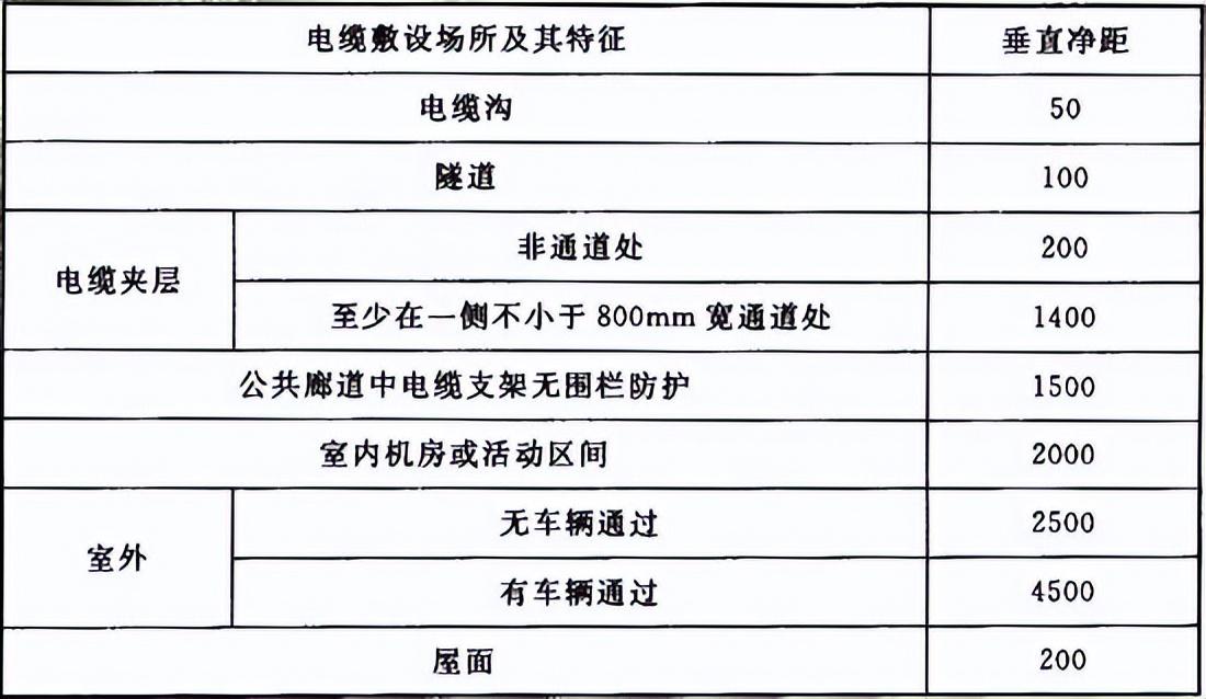 注:h为槽盒高度。3 最上层电缆支架距构筑物顶板或梁底的最小净距应满足电缆引接至上方配电柜、台、箱、盘时电缆弯曲半径的要求,且不宜小于表13.2.1-1所列数再加80mm~150mm;距其他设备的最小净距不应小于300mm,当无法满足要求时应设置防护板。4 当设计无要求时,最下层电缆支架距沟底、地面的最小距离不应小于表13.2.1-2的规定。
