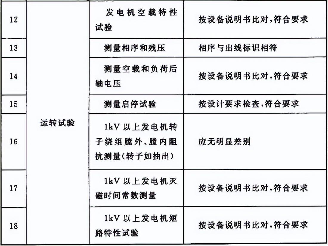 7.1.1 在建筑电气工程中,大型工程建筑选用高压发电机已较普遍,但无论是高压发电机还是低压发电机在制造厂均做出厂试验,合格后与柴油发动机组一起成套供货。安装后应按本规范规定做常规交接试验。由于电气交接试验是在空载情况下对发电机性能的考核,而负载情况下的考核要和柴油机有关试验一并进行,考核包括柴油机的调速特性能否满足供电质量要求等。7.1.2 由柴油发电机至配电室或经配套的控制柜至配电室的馈电线路,如果是电力电缆,通电前应按本条规定进行试验,绝缘电阻测试时兆欧表的选用应符合现行国家标准《电气装置安装工程电气设备交接试验标准》GB 50150的相关规定,如馈电线路是母线槽,则应按本规范对母线槽的验收规定进行检查和试验。7.1.3 柴油发电机的馈电线路是指由柴油发电机至配电室或经配套的控制柜至配电室的馈电线路,包括柴油发电机随机的出线开关柜间的馈电线路在内。原供电系统是指由市电供给的供电系统。核相是两个电源向同一供电系统供电的必要程序,虽然不出现并列运行,但相序一致才能确保用电设备的性能和安全。相序一致是指三相对应且交流变化规律一致。7.1.4 并列运行的柴油发电机的型号、规格、特性及配套设备是由设计来选择的,安装单位主要应保证并列运行的柴油发电机组的电气试验参数及测试数据应一致。7.1.5 同本规范第4.1.2条,对设计有发电机组的建筑工程属多电源供电系统,为防止星形结点(中性点)的多点接地,发电机星形结点(中性点)的接地连接方式及接地电阻值要求是由设计人员根据系统情况提出的,施工时,施工人员必须按图施工,以确保用电安全。