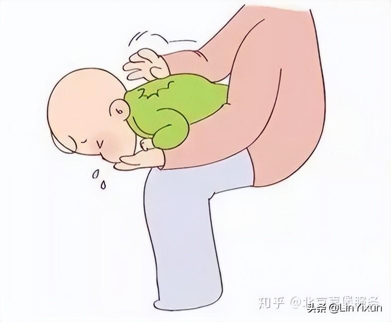 在进行5次拍背后,需将你的空手放在宝宝背部,用手掌托住宝宝后脑,将宝宝完全抱在你的两臂之间,用一只手掌托住宝宝脸部和下颌,另一只手掌托住宝宝后脑,小心托住宝宝头颈,同时将宝宝全身翻转过来,使宝宝面部朝上,你的前臂需靠在自己的大腿上,确保宝宝的头部低于躯干部位。