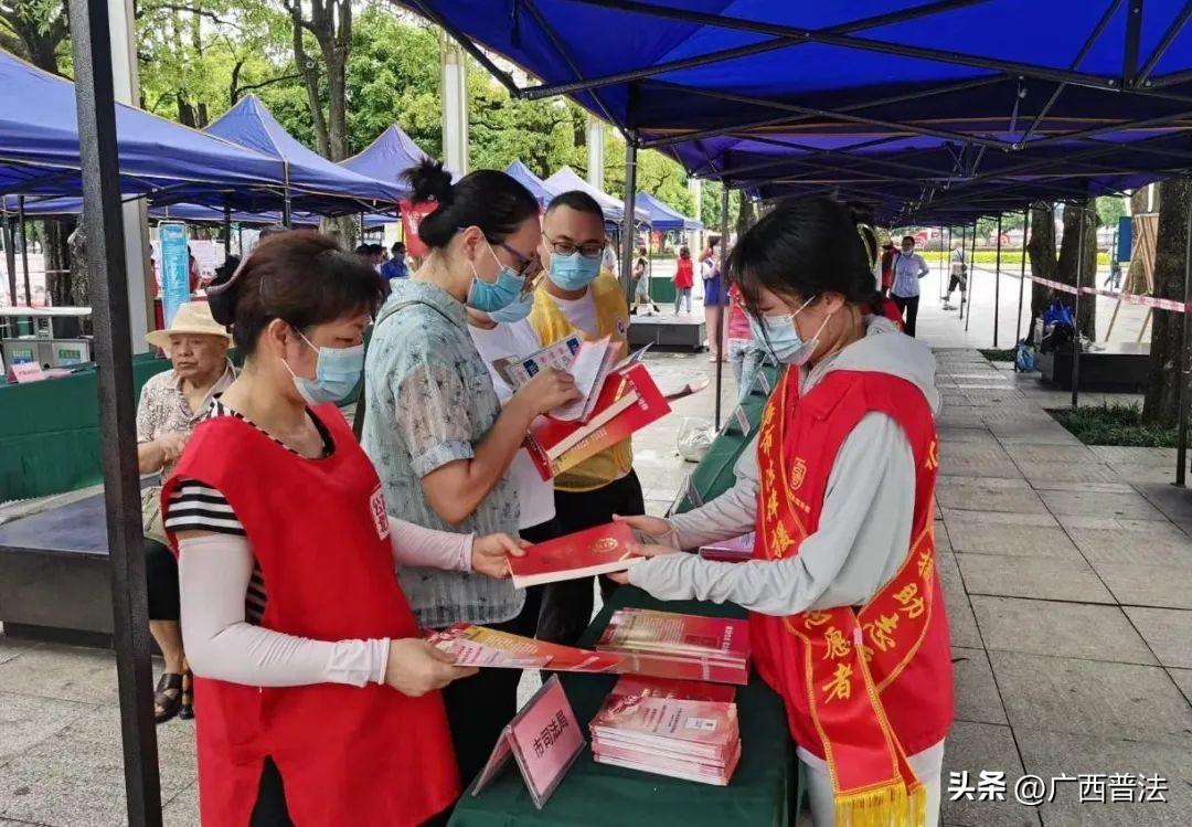北海市司法局法律援助志愿者向群众发放法律援助法宣传资料