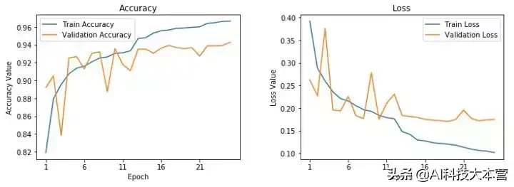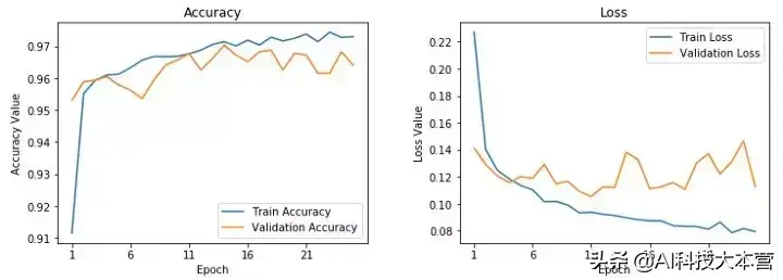 现在我们将训练该模型,在训练过程中所用到的配置和回调函数与模型1中的类似,完整的代码可以参考github链接。下图展示了在训练过程中,模型的准确度曲线和损失曲线。