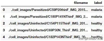从上述结果可以看到, 疟疾和非疟疾(未感染)的细胞图像的数据集均包含13779张图片,两个数据集的大小是相对平衡的。接下来我们将利用这些数据构建一个基于pandas的dataframe类型的数据,这对我们后续构建数据集很有帮助。