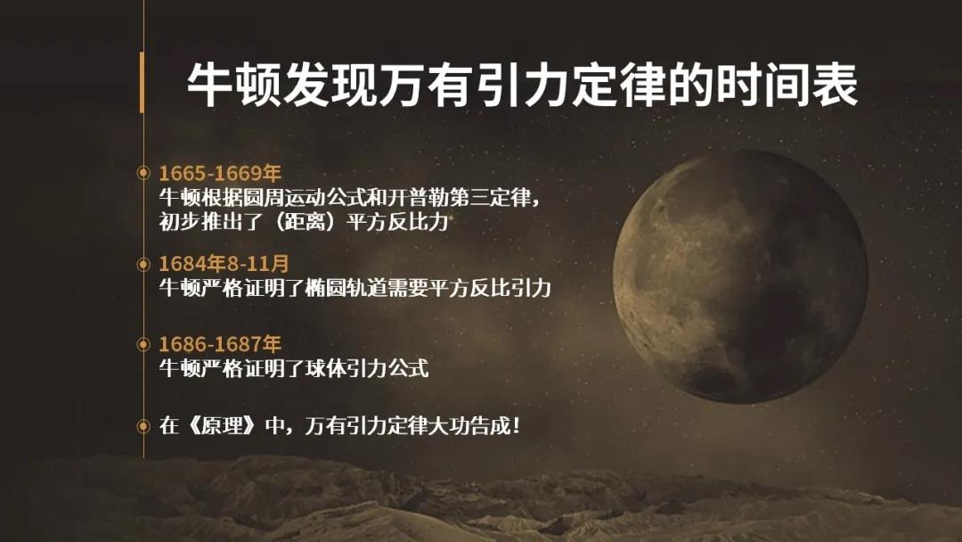 1665年—1669年,也就是瘟疫之年和瘟疫之后,牛顿初步推导出了平方反比力公式,1684年底严格证明了平方反比力公式。1686年—1687年严格证明了球体引力公式,1687年出版的这本《原理》里面万有引力定律才大功告成。