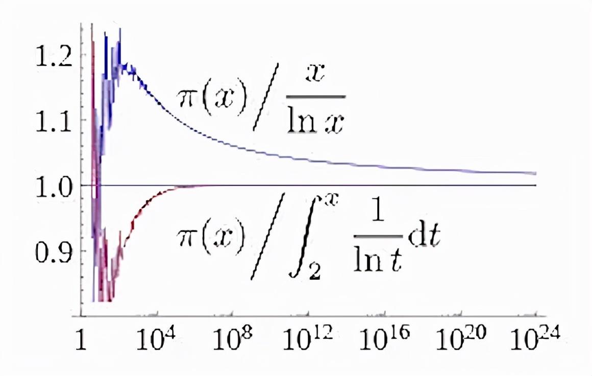 让我们回顾一下质数定理,它说的是随着x的增大,质数计数函数π(x)与对数积分函数Li(x)的比值趋近于1,如这个图所示。不过,π(x)与Li(x)的比值究竟是大于1还是小于1呢?也就是说,π(x)跟Li(x)相比是大还是小呢?