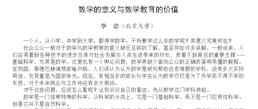 顺便说一句,李忠老师有一篇文章《数学的意义与数学教育的价值》,对数学的重要性与特殊性进行了深入的阐述,对许多违反教育规律的所谓“教育改革”提出了尖锐的批评,在这里向大家推荐。