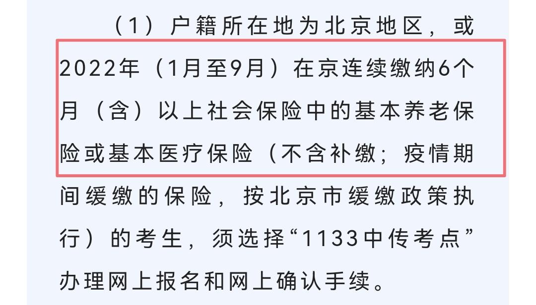 规定2022年(1月至9月)在北京连续缴纳6个月(含)以上社会保险中的基本养老保险或基本医疗保险的考生可以选择。