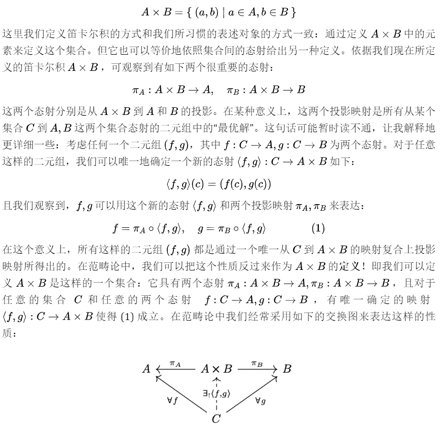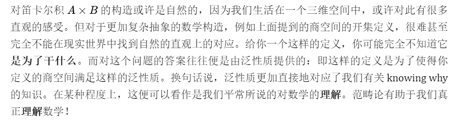 但更为重要的优势是,范畴论在观念层面统一了不同数学分支中的定义与概念。在范畴论发展之前,我们只有一个模糊地印象认为乘积拓扑、群的笛卡尔积和集合的笛卡尔积是“类似”的,但范畴论使得我们进一步清晰地认识到它们之间具体的关联:这些构造都是同一个概念在不同语境下的具体体现方式。这也是笔者为什么对范畴论情有独钟的原因。现代科学发展的一个非常明显的趋势便是学科之间的划分;不同领域的知识似乎被划分地越来越精细,我们越来越难以对其有一个整体的认识与把握。但范畴论的出现部分地打通了数学在观念层面上的分野,它找到了数学不同分支之间相同的观念基础!这实在是太难能可贵了!