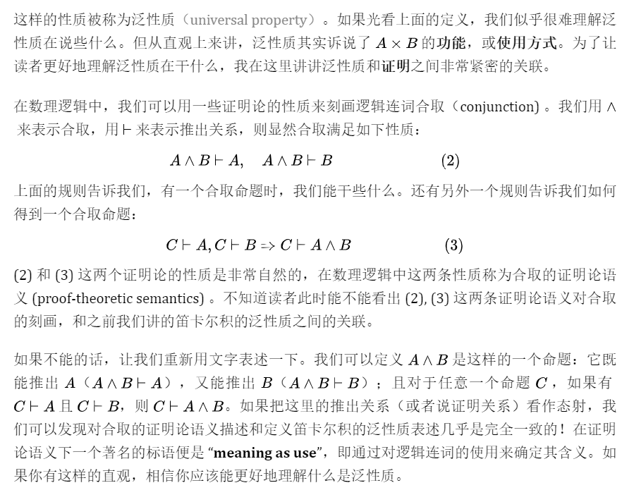 此处插一句题外话。上面提到的证明和泛性质之间的关联其实反映了逻辑与范畴论之间更加深层次的对应。在某种特定的意义下(我必须要强调不是在所有意义下),逻辑和范畴是等价的。但这篇初步介绍范畴论思想的文章无法涵盖这更深层次的联系。