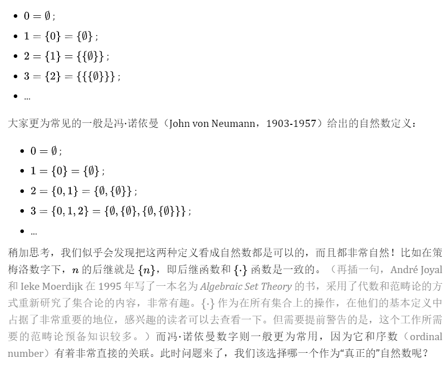 或许更为严重的是,一旦我们把单个自然数看作是一个确定的集合,由此会问出一些非常不自然且我们完全不关心的问题,比如“空集是否是 5 的一个元素”?在集合论的语境下,这是一个我们可以合理问出的问题,但这个问题的答案和我们理解自然数是无关的。