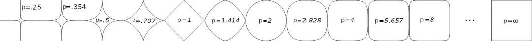根据pp的变化,范数也有着不同的变化,借用一个经典的有关P范数的变化图如下: