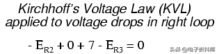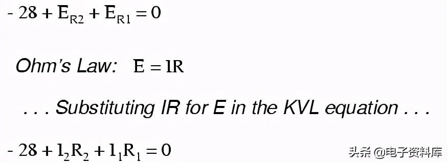 当然,我们还不知道什么是电压在R1或者R2,所以我们不能将这些值插入到方程数值数据。 然而,我们做知道这三个电压代数增加必须为零,因此,方程是正确的。 我们可以更进一步,未知电压表示为相应的未知电流(我的产物1和我2后)和各自的电阻,欧姆定律(E = IR),以及消除0项: