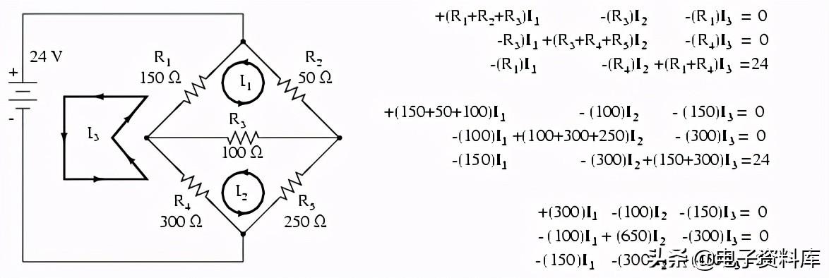 在这个方程中,我们代表了常见的电流的方向总结通过常见的电阻。 例如,电阻R3值为100Ω,有其电压降代表在上述100(我在任一瞬间方程的表达式1+我2我),因为这两种趋势1和我2通过R3从右到左。 同样的可能对电阻R说1,其压降表达式显示为150(我1+我3),因为我1和我3从下到上通过电阻,因此工作在一起产生电压降。