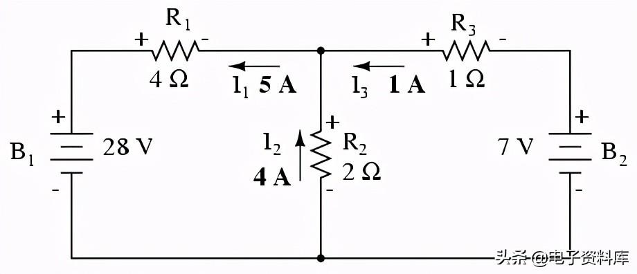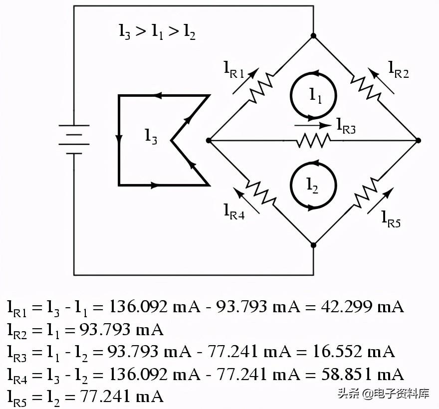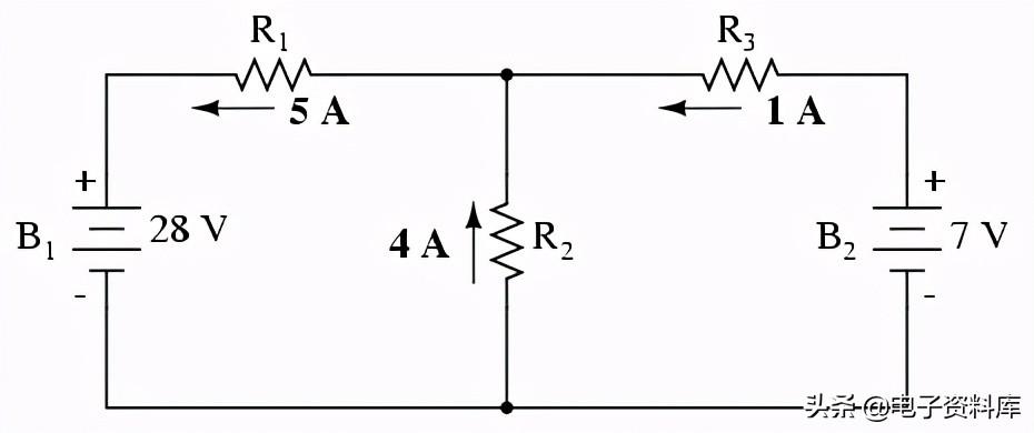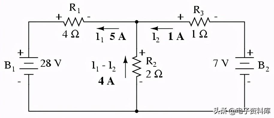 网目前的我1通过R是“上”吗2,而网现在的我2通过R是“向下”吗2。 确定实际电流R2我,我们必须看看网电流1和我2互动(在这种情况下,他们在反对),和代数将它们添加到到达最后一个值。 自从我1《飞屋环游记》在5安培,和我吗2“下来”1安培,真正的电流通过R2必须是一个值的4安培,“:”