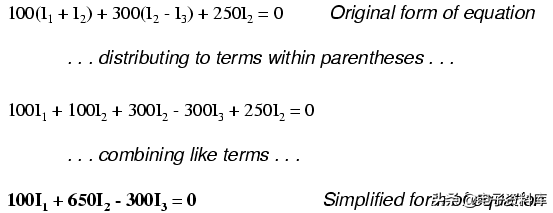 注意第二项方程的原始形式的电阻R4值为300Ω乘以区别我之间2和我3(我2——我3)。 这就是我们如何代表两网电流的综合效应相反的方向通过相同的组件。 选择合适的数学符号是非常重要的:300(我2——我3)并不意味着同样的事情在300年(我3——我2)。 我选择写300(我2——我3)因为我想首先我2的效果(创建一个积极的电压降,与一个虚拟电压表测量R4、红铅在底部和顶部黑铅),其次我3的效果(创建一个负电压下降,红铅在底部和顶部黑铅)。 如果我认为我3首先,我的影响2的影响其次,拿着我的虚拟电压表领导在同一位置在底部和黑色(红色),应该是-300(我的表达式3——我2)。 请注意,这个表达式是在数学上等价于第一个:+ 300(我2——我3)。