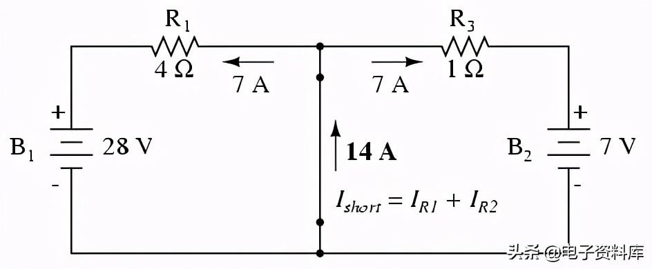 零电压负载阻抗之间的连接点,当前通过R1严格B的函数吗1的电压和R1的阻力:7安培(I = E / R)。 同样,当前通过R3现在严格B的函数2的电压和R3的阻力:7安培(I = E / R)。 总电流负载之间的短连接分是这两个电流的总和:7 + 7安培= 14安培。 14这个数字安培电流源(我诺顿Norton在我们的等效电路: