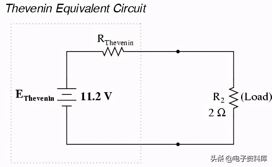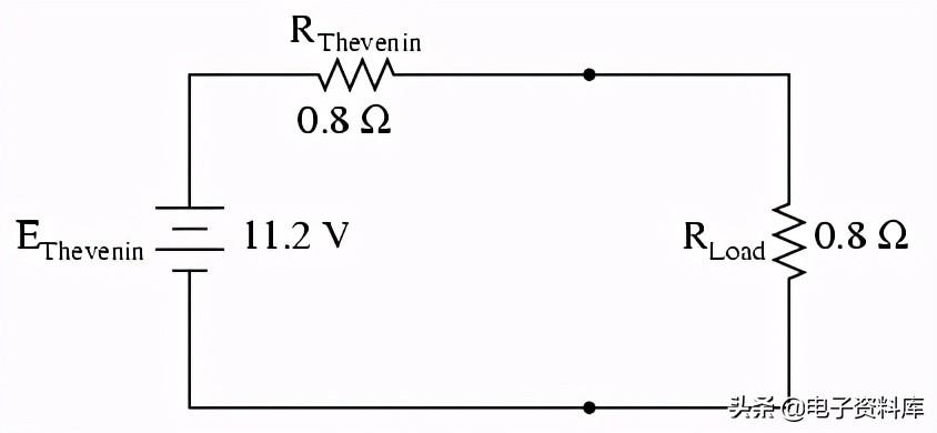 负载连接两点之间的电压可以认为从电池的电压和电阻的电压降,并出来11.2伏特。 这是我们的“等效发电机电压”(EThevenin在等效电路):