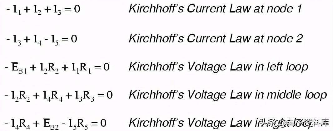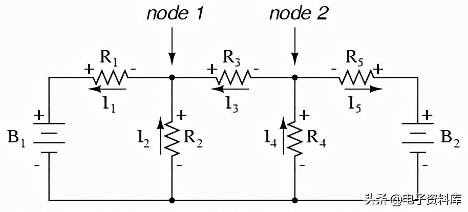 为了解决这个网络使用分支电流,我们必须建立五个变量占电路中每一个独特的电流(I1通过我5)。 这将需要五个方程解,两个氯化钾方程的形式和三个在任一瞬间方程(两个方程为氯化钾节点,和三个方程在任一瞬间在每个循环):
