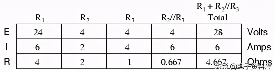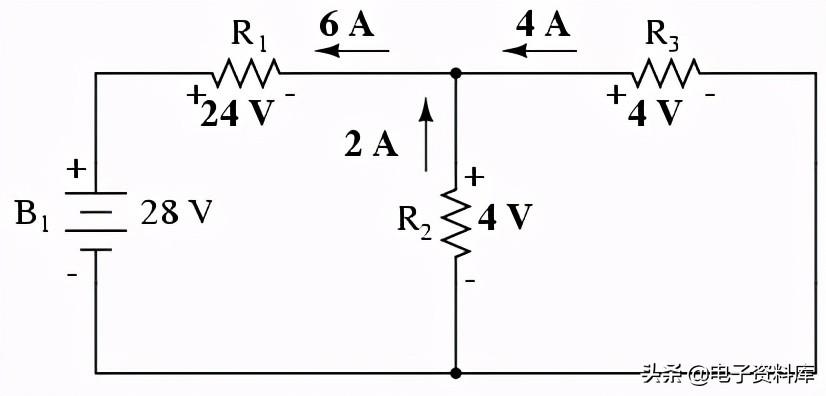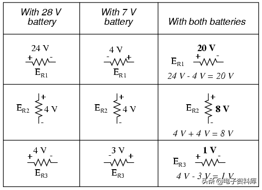 因为我们有两个电源电路,我们必须计算两组值电压降和/或电流,一个电路只有28伏电池的影响。