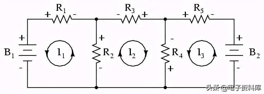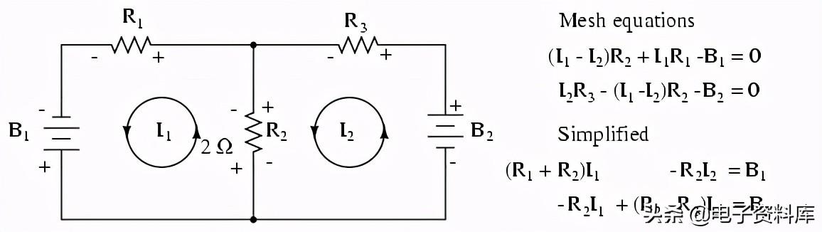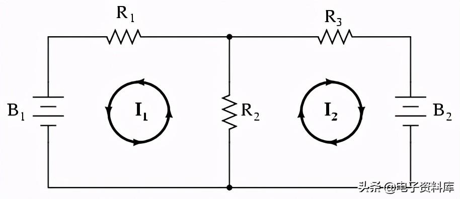 网当前方法的第一步是确定电路包括所有组件内的“循环”。 在我们的示例中,循环由B1, R1R2将第一个而形成的循环B2, R2R3将第二个。 最奇怪的部分网目前的方法是想象的循环电流在每个循环。 事实上,这种方法得名的想法这些水流循环像套旋转齿轮之间的啮合在一起: