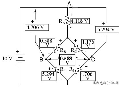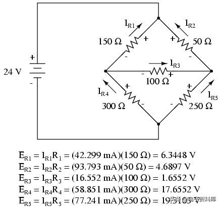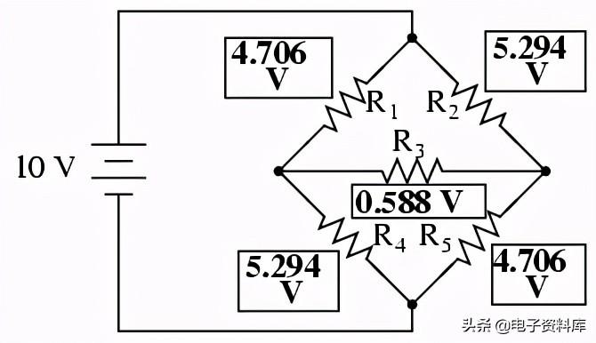 自R的比率1/ R4和R2/ R5是不平等的,我们知道会有电压电阻R3,一定量的电流。 讨论这一章的开始,这种类型的电路是由正常的不可约串并联分析,并可能只是分析了一些其他方法。