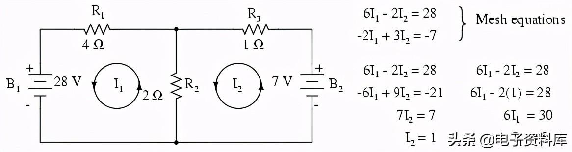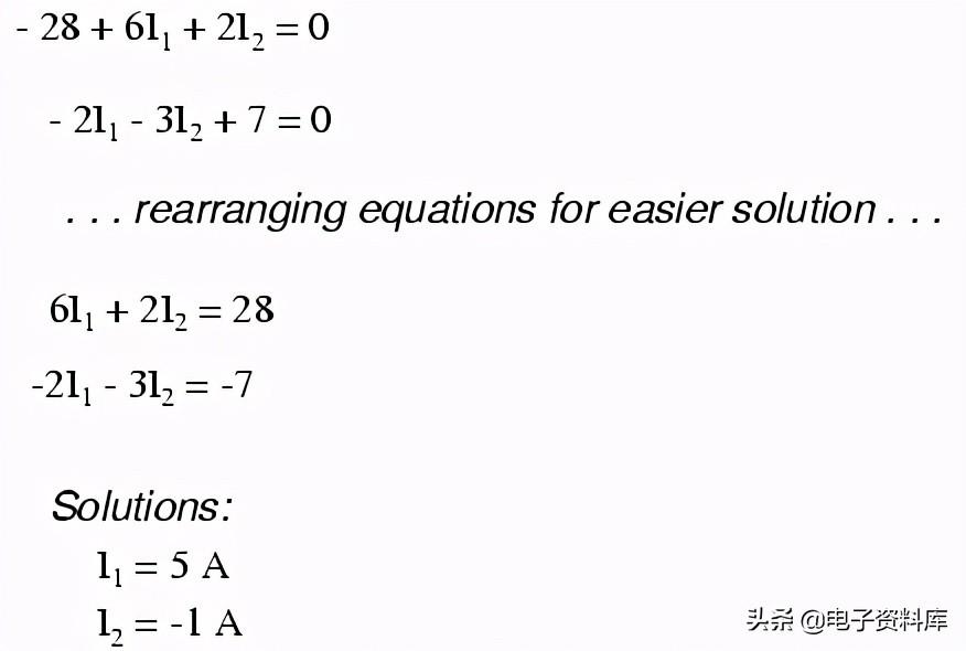 现在,有两个方程,我们可以用几种方法之一我数学上求解未知的电流1和我2: