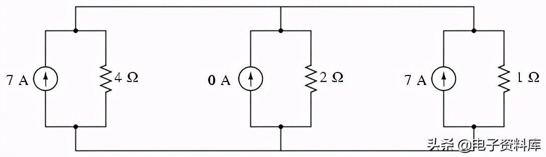 由于并行直接添加各自的电流源电流,电路的总电流将7 + 0 + 7,或14安培。 这添加诺顿源电流表示分子的米尔曼方程: