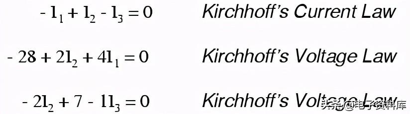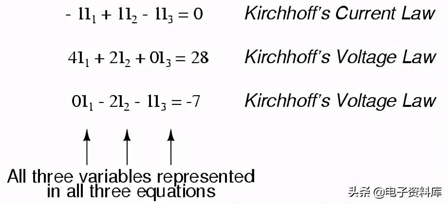 您可能想知道为什么我们经历的所有麻烦操纵这个方程从其最初形式(-28 + ER2 + ER1)。 毕竟,过去两届仍然是未知的,所以有什么优势来表达他们的未知的未知电压或电流(乘以电阻)? 这样做的目的是让在任一瞬间方程表示使用同样的未知变量的氯化钾方程,这是一个必要的要求任何联立方程的解决方案的方法。 为三个未知电流(我解决1,我2,我3),我们必须有这三个相关的三个方程电流(不电压)在一起。