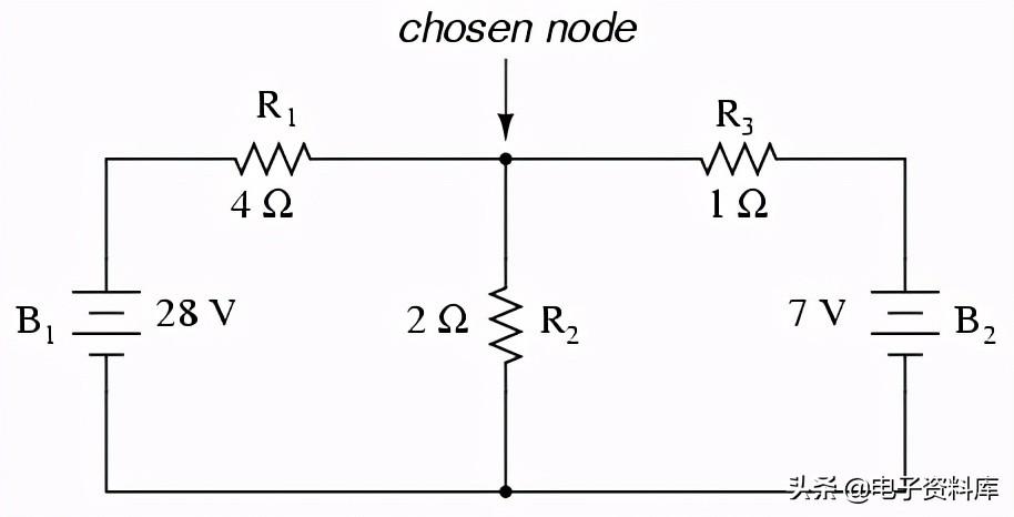 第一步是选择一个节点(结线)电路中使用的参考点我们未知的电流。 我将选择的节点加入R的权利1,R2,左边的R3。