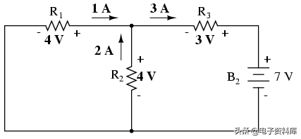 这种变化的电流方向是什么首先假定将改变极性的电压降在R2和R3由于目前我2。 从这里,我们可以说,当前通过R15安培,R上的电压降1电流和电阻的乘积(E = IR), 20伏(右边左边的积极的和消极的)。 同时,我们可以安全地说,当前通过R3是1安培,1伏特的电压降(E = IR),左边的积极和消极的在右边。 但什么是发生在R2吗?