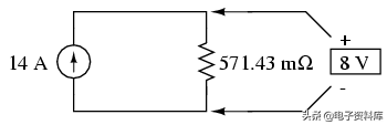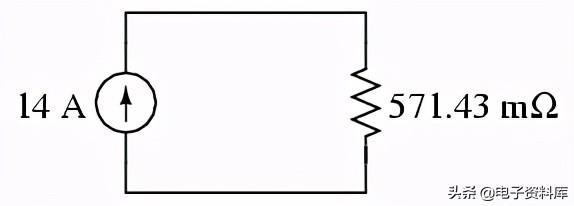 在这种情况下,总电阻等于571.43毫欧姆(571.43 mΩ)。 我们可以先用一个诺顿等效电路现在作为一个电流源和诺顿电阻: