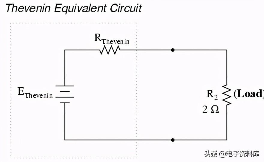 附加负载电阻(2Ω)点之间的连接,我们可以确定电压和电流通过它仿佛整个网络只不过是一个简单的串联电路: