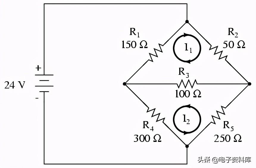 我们可以应用这个电路的支路电流法,但它需要六个电流(我1通过我6),导致非常大的一组联立方程来解决。 使用当前网格方法,不过,我们可以解出所有的电流和电压,减少变量。