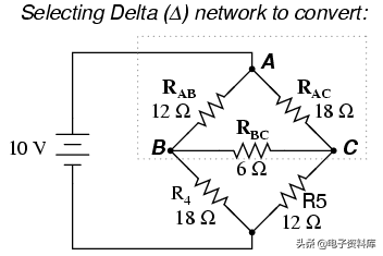 如果我们把电阻R1, R2R3作为连接在Δ配置(Rab, RacRbc分别)和生成一个等效Y网络来代替它们,我们可以把这座桥电路变成一个(简单的)串联/并联组合电路: