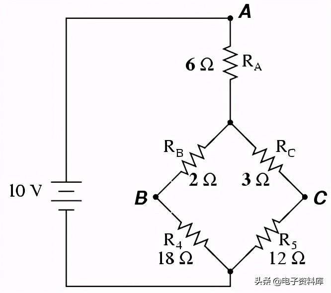 Δ-Y转换的主要应用是在不平衡电桥电路的解决方案,例如下图:
