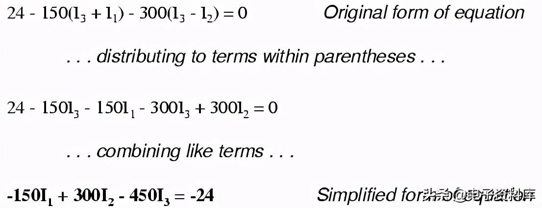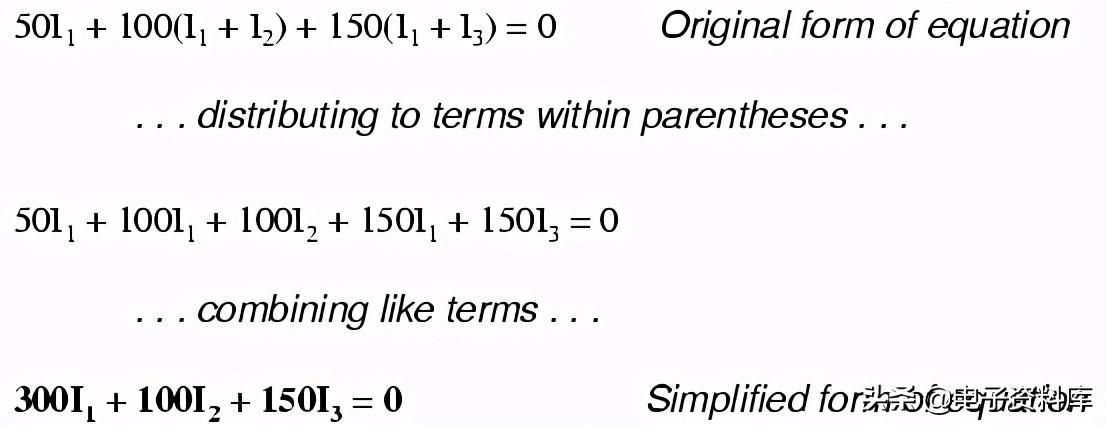 注意中间的方程使用网电流的总和我1和我2电流通过电阻R2。 这是因为我网电流1和我2要通过R同一个方向吗2,因此是相辅相成的。 分配系数2的我1和我2条款,然后结合我1条件的方程,我们可以简化: