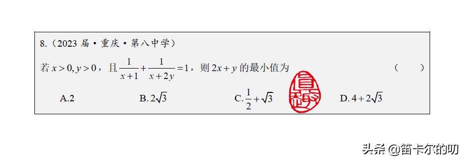 没有悬念,本题是一道条件最值问题,目标是构造均值不等式的使用结构。