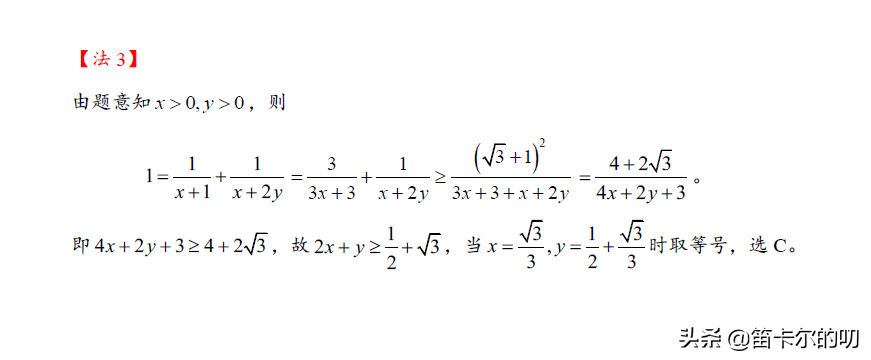 法3用到了“权方和不等式”(可用柯西不等式推导),较之法1更为干脆。权方和不等式是不错的工具,简单、好记、应用性强,我很喜欢。另外,求最值不要忘了检验取等的条件,有些题会故意在此设置陷阱。