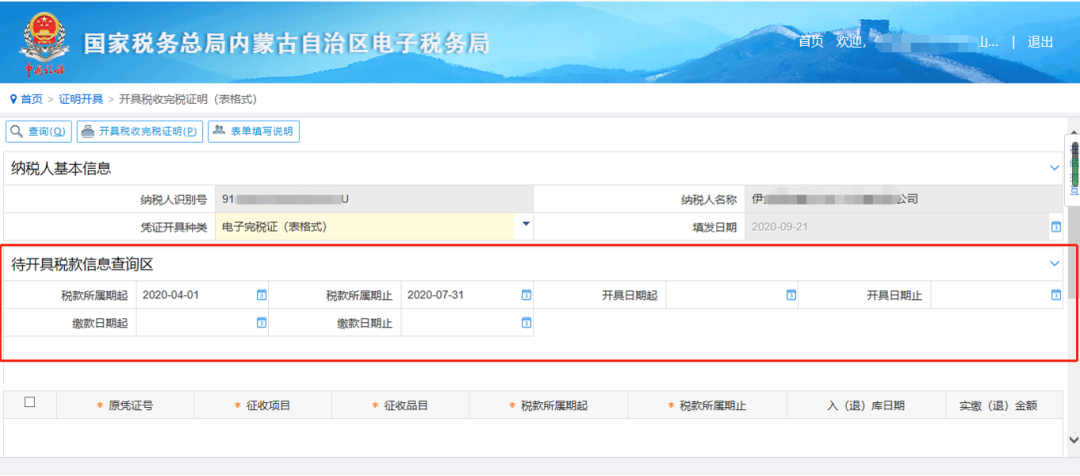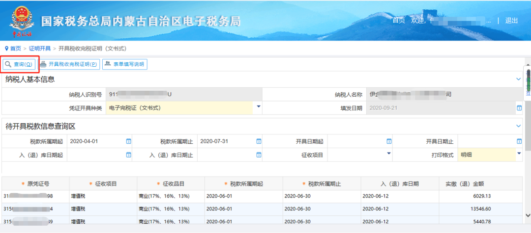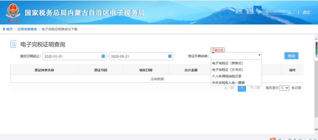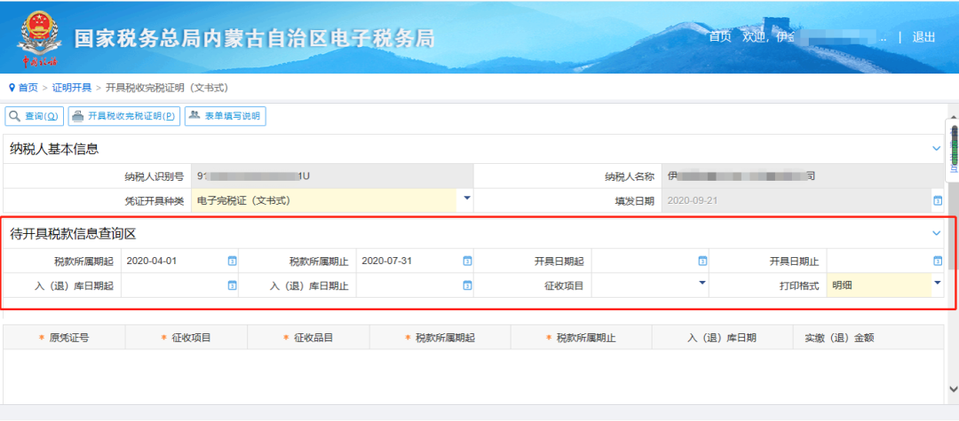 填写查询条件,【填发日期起止】和【凭证开具种类】,点击查询。
